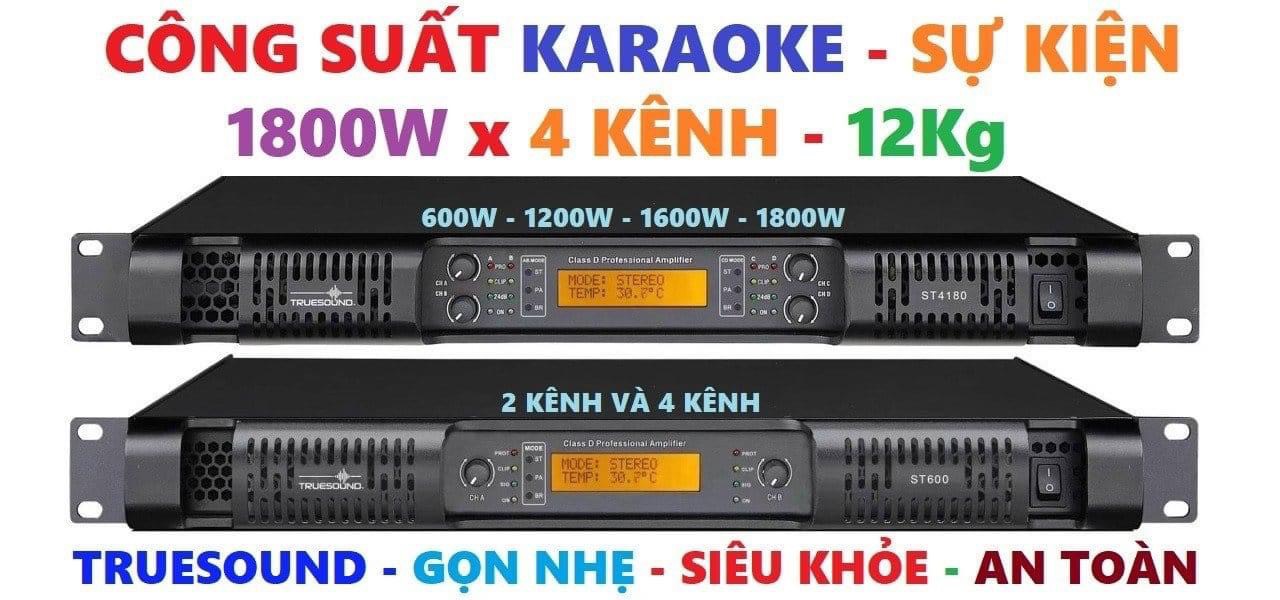 Công suất 4 kênh 1U Class D TRUESOUND ST4180 được thiết kế với 4 kênh 1800w/kênh trở kháng 8Ohm.