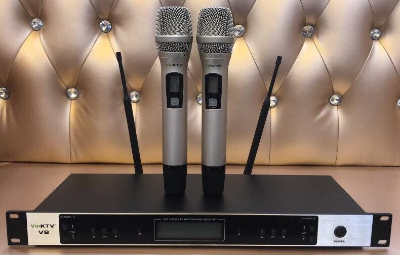 Micro karaoke VinKtv V8 là dòng sản phẩm cao cấp phục vụ cho nhu cầu giải trí, hát cho nhau nghe, biểu diễn, karaoke và hội thảo với độ nhậy cao tạo nên chất lượng âm thanh tuyệt vời và trong trẻo giúp bạn cải thiện giọng hát hay và mượt mà hơn. Ngoài ra Micro VinKTV có hơn 1000 kênh để thay đổi tần số các tay micro nên sẽ không bị trùng tần số - đảm bảo mỗi bộ micro là một tần số khác nhau sẽ không bị trùng lập khi cùng bật số lượng lớn Micro tại một không gian khoảng 1km. Không dừng lại ở đó Micro VinKTV còn có phạm vi sóng hoạt động rất xa trong phạm vi bán kính khoảng 200m bạn di chuyển tay micro xa với bộ nhận cũng không bị rớt sóng hoặc tậm tịn.